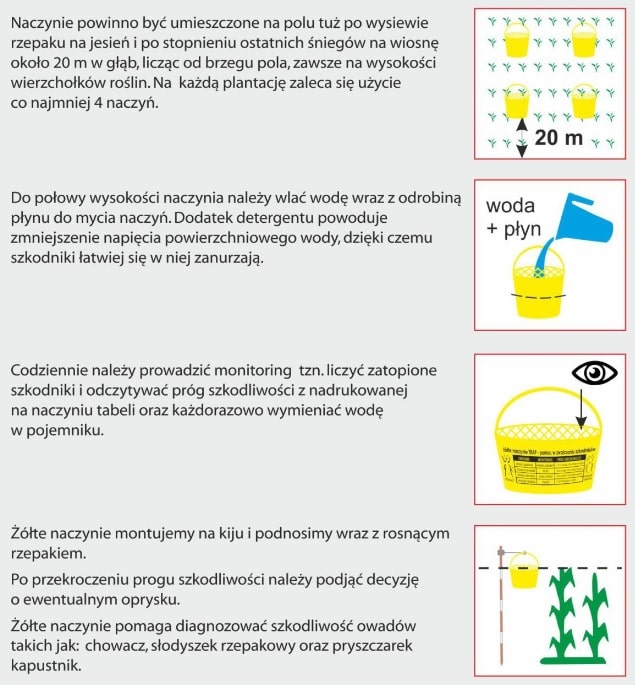 Żółte naczynie - pułapka na owady, pomocna w monitorowaniu szkodników i podejmowaniu rolnikom decyzji o ewentualnym oprysku. Pojemnik posiada nadrukowaną tabelę z progami szkodliwości owadów żerujących w rzepaku. Możliwe jest nadrukowanie indywidualnej tabeli szkodliwości według wskazań danego producenta środków chemicznych oraz nadruk logo.
