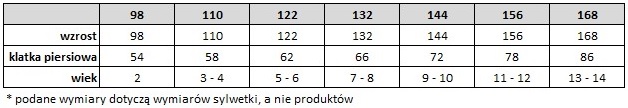 Dostępne rozmiary: 98, 110, 122, 132, 144, 156, 168.